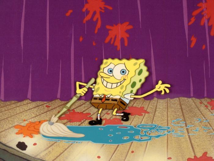 To create production cels, the original animator's drawing is transferred onto an acetate cel (by hand-inking and/or photo copying). The cel is then hand-painted on the reverse side. The printed background is ready to be matted and framed. It is a colored background with a cel and has the animator's notations at the bottom of the background and the cel. There is some slight paint fade to SpongeBob's outline. The background is a printed reproduction background. The cel has multiple layers; first is SpongeBob with a mop and the second cel is water.