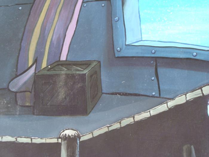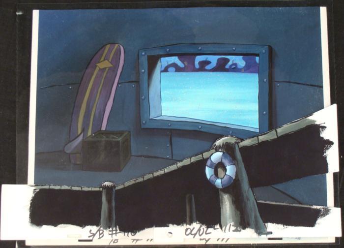 This original hand-painted background and animation cel are from the Nickelodeon TV show SpongeBob Squarepants. The story takes place under the deep blue sea in Bikini Bottom, where SpongeBob resides. SpongeBob, who is a yellow, porous sponge, is your typical happy-go-lucky character, as he is always cheerful and enjoys making people laugh. Patrick Star, SpongeBob's neighbor who is a starfish, is your average children's show idiot, as he boasts knowing nothing and is often getting himself into ridiculous situations. Between the homes of these two lies the home of the miserable Squidward, a squid, who is known for being grouchy and playing tricks on SpongeBob and Patrick. Both SpongeBob and Squidward work at the Krusty Krab, a fast food business run by the greedy money-loving Mr. Krabs, a crab, the arch rival of the evil, possibly misunderstood, Plankton. Another neighbor, Sandy Cheeks, an athletic squirrel who normally wears an astronaut's space suit, was introduced in "Tea at the Treedome." She spends most of her time inventing and experimenting. Shown here is an apparent aquatic shed.Original Production Background and Animated Cel Overall Size of Background: 10 1/4" x 12 3/4" Overall Size of the Cel: 10 1/2" x 14 1/4" Very good condition; it has been stored rolled This is an original hand-painted cel set-up used in the production of an episode of "SpongeBob SquarePants." Each one-of-a-kind set-up represents a slight change in position of the characters. When individually photographed and projected in rapid succession, the images appear to move.