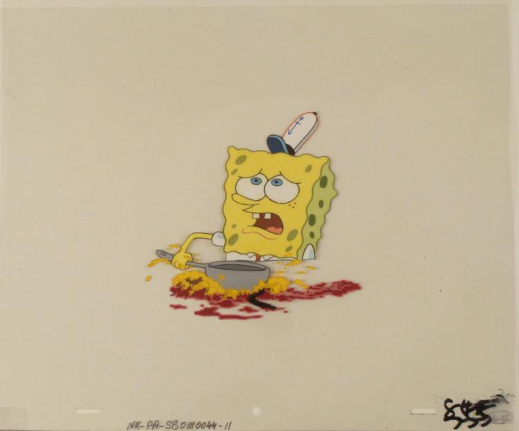 This original animation cel is from the Nickelodeon TV show SpongeBob Squarepants. The story takes place under the deep blue sea in Bikini Bottom, where SpongeBob resides. SpongeBob, who is a yellow, porous sponge, is your typical happy-go-lucky character, as he is always cheerful and enjoys making people laugh. Patrick Star, SpongeBob's neighbor who is a starfish, is your average children's show idiot, as he boasts knowing nothing and is often getting himself into ridiculous situations. Between the homes of these two lies the home of the miserable Squidward, a squid, who is known for being grouchy and playing tricks on SpongeBob and Patrick. Both SpongeBob and Squidward work at the Krusty Krab, a fast food business run by the greedy money-loving Mr. Krabs, a crab, the arch rival of the evil, possibly misunderstood, Plankton. Another neighbor, Sandy Cheeks, an athletic squirrel who normally wears an astronaut's space suit, was introduced in "Tea at the Treedome." She spends most of her time inventing and experimenting. * This definitely was NOT in the job description. * Original Production Animated Cel Overall Size of Cel: 10 1/2" x 12 1/2" Very Good Condition This is an original hand-painted cel set-up used in the production of an episode of "SpongeBob SquarePants." Each one-of-a-kind set-up represents a slight change in position of the characters. When individually photographed and projected in rapid succession, the images appear to move. * To create production cels, the original animator's drawing is transferred onto an acetate cel (by hand-inking and/or photo copying). The cel is then hand-painted on the reverse side. * The cel is ready to be matted and framed. The animator's notations are at the bottom of the cel. The cel is multi-layered, first is the splatter of red sauce and next is the main image. There is some red paint and paper residue on the back of the cel. *