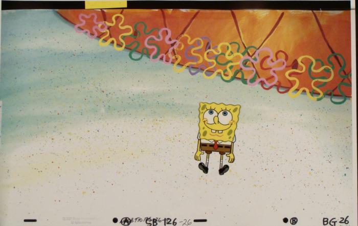 This animation cel and reproduction background are from the Nickelodeon TV show SpongeBob Squarepants. The story takes place under the deep blue sea in Bikini Bottom, where SpongeBob resides. SpongeBob, who is a yellow, porous sponge, is your typical happy-go-lucky character, as he is always cheerful and enjoys making people laugh. Patrick Star, SpongeBob's neighbor who is a starfish, is your average children's show idiot, as he boasts knowing nothing and is often getting himself into ridiculous situations. Between the homes of these two lies the home of the miserable Squidward, a squid, who is known for being grouchy and playing tricks on SpongeBob and Patrick. Both SpongeBob and Squidward work at the Krusty Krab, a fast food business run by the greedy money-loving Mr. Krabs, a crab, the arch rival of the evil, possibly misunderstood, Plankton. Another neighbor, Sandy Cheeks, an athletic squirrel who normally wears an astronaut's space suit, was introduced in "Tea at the Treedome." She spends most of her time inventing and experimenting. Spongebob seems to be awfully perky...Original Printed Background and Animated Cel Overall Size of Background: 11" x 17" Overall Size of the Cel: 10 1/2" x 20 1/2" Excellent condition This is an original hand-painted cel set-up used in the production of an episode of "SpongeBob SquarePants." Each one-of-a-kind set-up represents a slight change in position of the characters. When individually photographed and projected in rapid succession, the images appear to move.