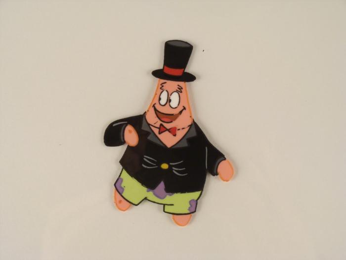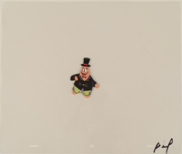This original animation cel is from the Nickelodeon TV show SpongeBob Squarepants. The story takes place under the deep blue sea in Bikini Bottom, where SpongeBob resides. SpongeBob, who is a yellow, porous sponge, is your typical happy-go-lucky character, as he is always cheerful and enjoys making people laugh. Patrick Star, SpongeBob's neighbor who is a starfish, is your average children's show idiot, as he boasts knowing nothing and is often getting himself into ridiculous situations. Between the homes of these two lies the home of the miserable Squidward, a squid, who is known for being grouchy and playing tricks on SpongeBob and Patrick. Both SpongeBob and Squidward work at the Krusty Krab, a fast food business run by the greedy money-loving Mr. Krabs, a crab, the arch rival of the evil, possibly misunderstood, Plankton. Another neighbor, Sandy Cheeks, an athletic squirrel who normally wears an astronaut's space suit, was introduced in "Tea at the Treedome." She spends most of her time inventing and experimenting. Patrick seems to be loving his new suitOriginal Production Animated Cel Overall Size of Cel: 10 1/2" x 12 1/2" Very Good ConditionThis is an original hand-painted cel set-up used in the production of an episode of "SpongeBob SquarePants." Each one-of-a-kind set-up represents a slight change in position of the characters. When individually photographed and projected in rapid succession, the images appear to move.