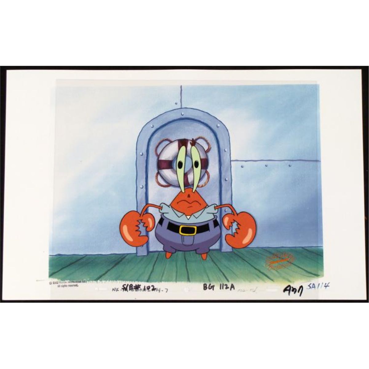 Normal 0 false false false MicrosoftInternetExplorer4 /* Style Definitions */ table.MsoNormalTable{mso-style-name:"Table Normal";mso-tstyle-rowband-size:0;mso-tstyle-colband-size:0;mso-style-noshow:yes;mso-style-parent:"";mso-padding-alt:0in 5.4pt 0in 5.4pt;mso-para-margin:0in;mso-para-margin-bottom:.0001pt;mso-pagination:widow-orphan;font-size:10.0pt;font-family:"Times New Roman";mso-ansi-language:#0400;mso-fareast-language:#0400;mso-bidi-language:#0400;}This animation cel and reproduction background are from the NickelodeonTV show SpongeBob Squarepants. The story takes place under the deepblue sea in Bikini Bottom, where SpongeBob resides. SpongeBob, who is ayellow, porous sponge, is your typical happy-go-lucky character, as he isalways cheerful and enjoys making people laugh. Patrick Star, SpongeBob'sneighbor who is a starfish, is your average children's show idiot, as he boastsknowing nothing and is often getting himself into ridiculous situations.Between the homes of these two lies the home of the miserable Squidward, asquid, who is known for being grouchy and playing tricks on SpongeBob andPatrick. Both SpongeBob and Squidward work at the Krusty Krab, a fast foodbusiness run by the greedy money-loving Mr. Krabs, a crab, the arch rival ofthe evil, possibly misunderstood, Plankton. Another neighbor, Sandy Cheeks, anathletic squirrel who normally wears an astronaut's space suit, was introducedin "Tea at the Treedome." She spends most of her time inventing andexperimenting. * Mr. Krabs appears to have an anxious look on his face. * * Original Printed Background and Animated Cel Overall Size of Background: 11" x 17" Overall Size of the Cel: 10 1/2" x 12 1/2" Excellent condition This is an original hand-painted cel set-up used in the productionof an episode of "SpongeBob SquarePants", titled Squeaky Boots. Each one-of-a-kind set-uprepresents a slight change in position of the characters. When individuallyphotographed and projected in rapid succession, the images appear to move. * To create production cels, the original animator's drawing is transferred ontoan acetate cel (by hand-inking and/or photo copying). The cel is thenhand-painted on the reverse side. The background accompanying this set-upis a reproduction background. * The printed background and cel are ready to be mattedand framed. The notations are located at the bottom of both. The Nickelodeon logo is located at the bottom right of the cel. * *