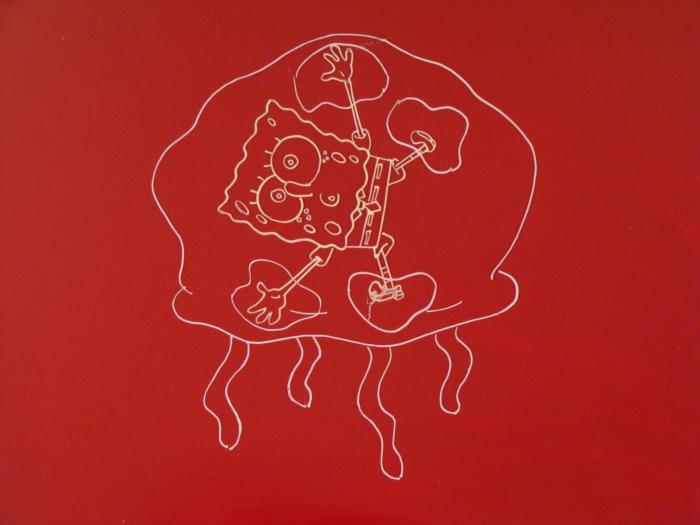 To create production cels, the original animator's drawing is transferred onto an acetate cel (by hand-inking and/or photo copying). The cel is then hand-painted on the reverse side. The cel is ready to be matted and framed. The animator's notations are at the bottom of the cels. The cel is multi-layer: first is Spongebob and the jellyfish and next is the red painted cel. There is some paper residue on the back of the second cel.