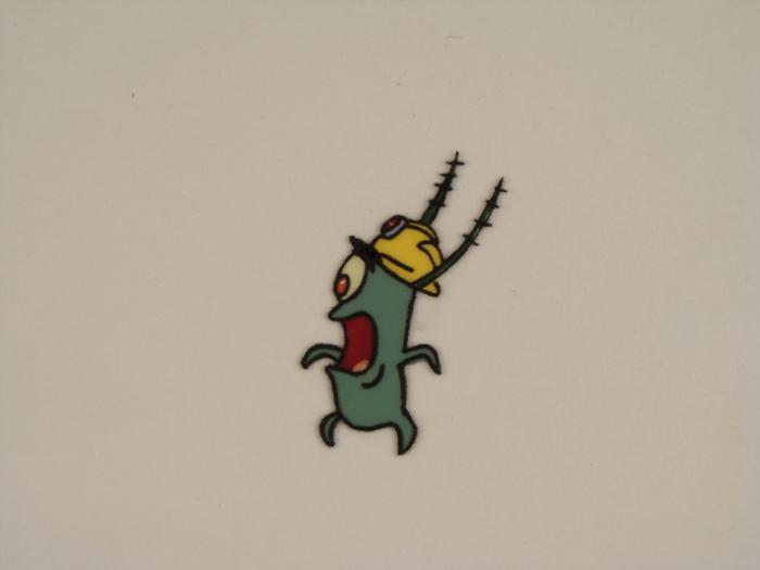 This original animation cel is from the Nickelodeon TV show SpongeBob Squarepants. The story takes place under the deep blue sea in Bikini Bottom, where SpongeBob resides. SpongeBob, who is a yellow, porous sponge, is your typical happy-go-lucky character, as he is always cheerful and enjoys making people laugh. Patrick Star, SpongeBob's neighbor who is a starfish, is your average children's show idiot, as he boasts knowing nothing and is often getting himself into ridiculous situations. Between the homes of these two lies the home of the miserable Squidward, a squid, who is known for being grouchy and playing tricks on SpongeBob and Patrick. Both SpongeBob and Squidward work at the Krusty Krab, a fast food business run by the greedy money-loving Mr. Krabs, a crab, the arch rival of the evil, possibly misunderstood, Plankton. Another neighbor, Sandy Cheeks, an athletic squirrel who normally wears an astronaut's space suit, was introduced in "Tea at the Treedome." She spends most of her time inventing and experimenting. In this cel, it appears that Plankton is hard at work but doesn't like the results.Original Production Animated Cel Overall Size of Cel: 10 1/2" x 12 1/2" Excellent ConditionThis is an original hand-painted cel set-up used in the production of an episode of "SpongeBob SquarePants." Each one-of-a-kind set-up represents a slight change in position of the characters. When individually photographed and projected in rapid succession, the images appear to move.