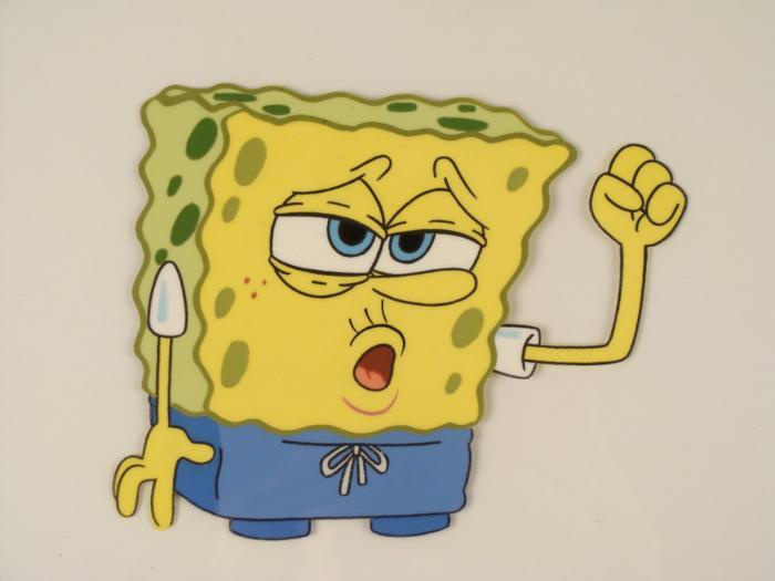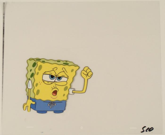 This original animation cel is from the Nickelodeon TV show SpongeBob Squarepants. The story takes place under the deep blue sea in Bikini Bottom, where SpongeBob resides. SpongeBob, who is a yellow, porous sponge, is your typical happy-go-lucky character, as he is always cheerful and enjoys making people laugh. Patrick Star, SpongeBob's neighbor who is a starfish, is your average children's show idiot, as he boasts knowing nothing and is often getting himself into ridiculous situations. Between the homes of these two lies the home of the miserable Squidward, a squid, who is known for being grouchy and playing tricks on SpongeBob and Patrick. Both SpongeBob and Squidward work at the Krusty Krab, a fast food business run by the greedy money-loving Mr. Krabs, a crab, the arch rival of the evil, possibly misunderstood, Plankton. Another neighbor, Sandy Cheeks, an athletic squirrel who normally wears an astronaut's space suit, was introduced in "Tea at the Treedome." She spends most of her time inventing and experimenting. SpongeBob is feeling blue.Original Production Animated Cel Overall Size of Cel: 10 1/2" x 12 1/2" Very Good ConditionThis is an original hand-painted cel set-up used in the production of an episode of "SpongeBob SquarePants." Each one-of-a-kind set-up represents a slight change in position of the characters. When individually photographed and projected in rapid succession, the images appear to move.