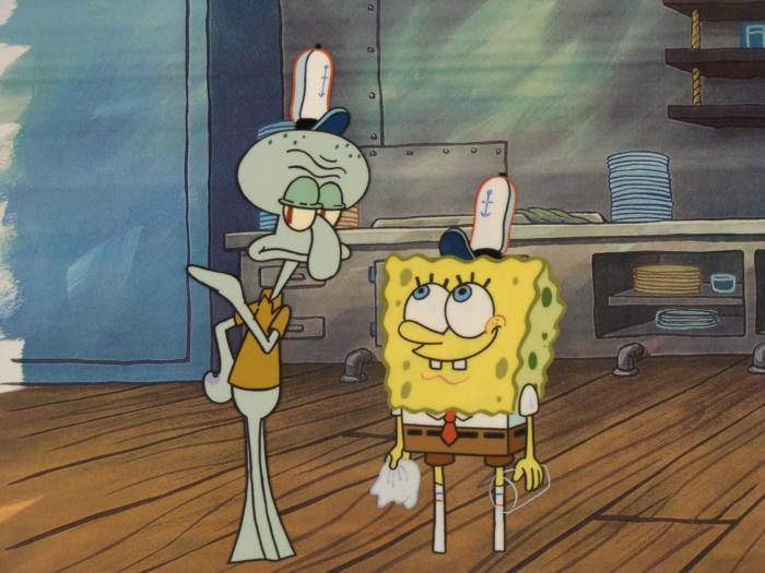 This animation cel and reproduction background are from the Nickelodeon TV show SpongeBob Squarepants. The story takes place under the deep blue sea in Bikini Bottom, where SpongeBob resides. SpongeBob, who is a yellow, porous sponge, is your typical happy-go-lucky character, as he is always cheerful and enjoys making people laugh. Patrick Star, SpongeBob's neighbor who is a starfish, is your average children's show idiot, as he boasts knowing nothing and is often getting himself into ridiculous situations. Between the homes of these two lies the home of the miserable Squidward, a squid, who is known for being grouchy and playing tricks on SpongeBob and Patrick. Both SpongeBob and Squidward work at the Krusty Krab, a fast food business run by the greedy money-loving Mr. Krabs, a crab, the arch rival of the evil, possibly misunderstood, Plankton. Another neighbor, Sandy Cheeks, an athletic squirrel who normally wears an astronaut's space suit, was introduced in "Tea at the Treedome." She spends most of her time inventing and experimenting. SpongeBob seems to be cleaning a glass.Original Printed Background and Animated Cel Overall Size of Background: 11" x 17" Overall Size of the Cel: 10 1/2" x 12 1/2" Very good condition; it has been storedThis is an original hand-painted cel set-up used in the production of an episode of "SpongeBob SquarePants." Each one-of-a-kind set-up represents a slight change in position of the characters. When individually photographed and projected in rapid succession, the images appear to move.