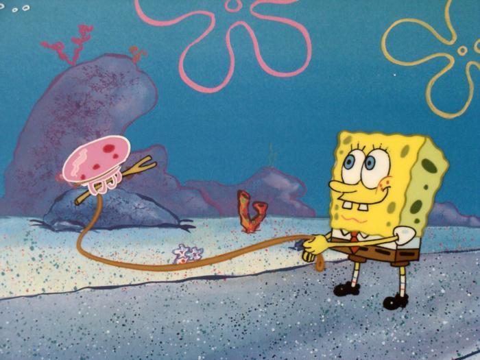 To create production cels, the original animator's drawing is transferred onto an acetate cel (by hand-inking and/or photo copying). The cel is then hand-painted on the reverse side. The printed background is ready to be matted and framed. It is a colored background with a cel and has the animator's notations at the bottom of the background and the cel. The background is a printed reproduction background. The cel has multiple layers; first is the bubbles, then is the jellyfish, and the last cel is SpongeBob. There is a Nickelodeon TV logo on the bottom right of the cel. There is some slight paint fade to SpongeBob's outline