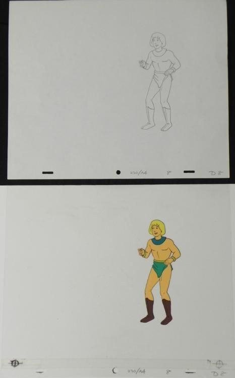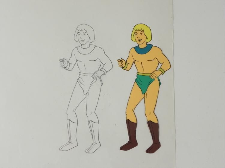 The Herculoids battled to defend their planet from menaces on Amzot/Quasar and from outer space. All of the Herculoids displayed Human-level intelligence - employing precision teamwork and complex tactics - as well as emotions, and Zandor and Tara both displayed a working knowledge of complex alien technologies as well as the ability to pilot interstellar spacecraft-but essentially, Zandor, Tara, Dorno, and the Herculoids were fighting to keep Amzot/Quasar a technology-free, primitive planet. This is frther indicated by the pseudo-barbarian outfits of Zandor, Tara, and Dorno and the fact that technology was used mainly by the various villains, but rarely if ever by the heroes. Although the "speech" of their companions was limited and repetitive, Zandor, Tara and Dorno demonstrated that Gloop and Gleep, at least, had a comprehensive mode of communication, and that they could at least understand and interpret this language. **The cel and drawing are at least 35 years old. Uh-huh, uh-huh... Yeah!!! Great idea!!! Original Animation and Drawing Original "rough" animation drawing, in black and non-photo blue pencil with the notations in black. Overall Size of Drawing: 10 1/2" x 12 1/2" Overall Size of the Cel: 10 1/2" x 12 1/2" Overall condition: Cel- Very good; minor wear to Dorno's outline & Drawing- Excellent This is an original hand-painted cel used in the production of an episode of "Herculoids." Each cel represents a slight change in position of the characters. When individually photographed and projected in rapid succession, the images appear to move. To create production cels, the original animator's drawing is transferred onto an acetate cel (by hand-inking and/or photo copying). The cel is then hand-painted on the reverse side. The drawing and cel are ready to be matted and framed. The notations are located at the bottom of both (taped to the bottom of the cel).