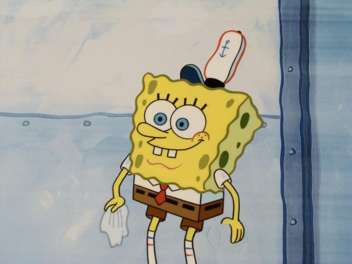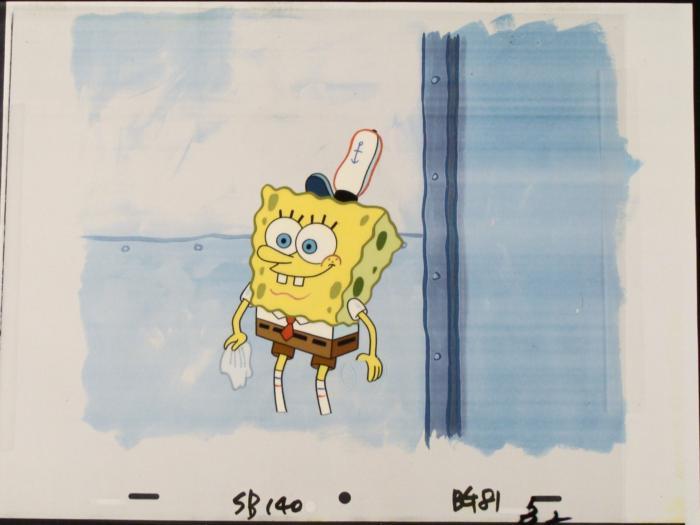This animation cel and reproduction background are from the Nickelodeon TV show SpongeBob Squarepants. The story takes place under the deep blue sea in Bikini Bottom, where SpongeBob resides. SpongeBob, who is a yellow, porous sponge, is your typical happy-go-lucky character, as he is always cheerful and enjoys making people laugh. Patrick Star, SpongeBob's neighbor who is a starfish, is your average children's show idiot, as he boasts knowing nothing and is often getting himself into ridiculous situations. Between the homes of these two lies the home of the miserable Squidward, a squid, who is known for being grouchy and playing tricks on SpongeBob and Patrick. Both SpongeBob and Squidward work at the Krusty Krab, a fast food business run by the greedy money-loving Mr. Krabs, a crab, the arch rival of the evil, possibly misunderstood, Plankton. Another neighbor, Sandy Cheeks, an athletic squirrel who normally wears an astronaut's space suit, was introduced in "Tea at the Treedome." She spends most of her time inventing and experimenting. SpongeBob has a cloth and a glass cup.Original Printed Background and Animated Cel Overall Size of Background: 11" x 17" Overall Size of the Cel: 10 1/2" x 12 1/2" Very good condition This is an original hand-painted cel set-up used in the production of an episode of "SpongeBob SquarePants." Each one-of-a-kind set-up represents a slight change in position of the characters. When individually photographed and projected in rapid succession, the images appear to move.