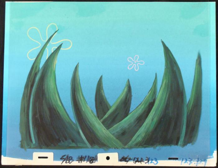 This original hand-painted background and animation cel are from the Nickelodeon TV show SpongeBob Squarepants. The story takes place under the deep blue sea in Bikini Bottom, where SpongeBob resides. SpongeBob, who is a yellow, porous sponge, is your typical happy-go-lucky character, as he is always cheerful and enjoys making people laugh. Patrick Star, SpongeBob's neighbor who is a starfish, is your average children's show idiot, as he boasts knowing nothing and is often getting himself into ridiculous situations. Between the homes of these two lies the home of the miserable Squidward, a squid, who is known for being grouchy and playing tricks on SpongeBob and Patrick. Both SpongeBob and Squidward work at the Krusty Krab, a fast food business run by the greedy money-loving Mr. Krabs, a crab, the arch rival of the evil, possibly misunderstood, Plankton. Another neighbor, Sandy Cheeks, an athletic squirrel who normally wears an astronaut's space suit, was introduced in "Tea at the Treedome." She spends most of her time inventing and experimenting. Why are the clouds shaped as flowers?Original Production Background and Animated Cel Overall Size of Background: 10 1/2" x 13" Overall Size of the Cel: 10 1/2" x 12 1/2" Very good condition This is an original hand-painted cel set-up used in the production of an episode of "SpongeBob SquarePants." Each one-of-a-kind set-up represents a slight change in position of the characters. When individually photographed and projected in rapid succession, the images appear to move.