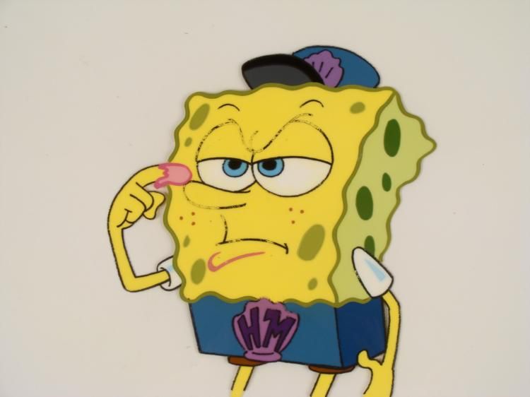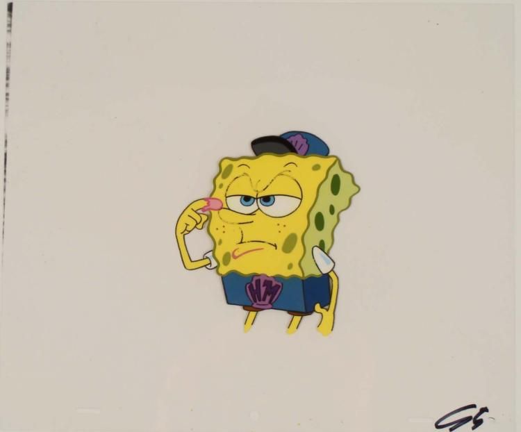 Normal 0 false false false MicrosoftInternetExplorer4 /* Style Definitions */ table.MsoNormalTable{mso-style-name:"Table Normal";mso-tstyle-rowband-size:0;mso-tstyle-colband-size:0;mso-style-noshow:yes;mso-style-parent:"";mso-padding-alt:0in 5.4pt 0in 5.4pt;mso-para-margin:0in;mso-para-margin-bottom:.0001pt;mso-pagination:widow-orphan;font-size:10.0pt;font-family:"Times New Roman";mso-ansi-language:#0400;mso-fareast-language:#0400;mso-bidi-language:#0400;}This original animation cel is from the Nickelodeon TV showSpongeBob Squarepants. The story takes place under the deep blue seain Bikini Bottom, where SpongeBob resides. SpongeBob, who is a yellow,porous sponge, is your typical happy-go-lucky character, as he is alwayscheerful and enjoys making people laugh. Patrick Star, SpongeBob's neighbor whois a starfish, is your average children's show idiot, as he boasts knowingnothing and is often getting himself into ridiculous situations. Between the homesof these two lies the home of the miserable Squidward, a squid, who is knownfor being grouchy and playing tricks on SpongeBob and Patrick. Both SpongeBoband Squidward work at the Krusty Krab, a fast food business run by the greedymoney-loving Mr. Krabs, a crab, the arch rival of the evil, possiblymisunderstood, Plankton. Another neighbor, Sandy Cheeks, an athletic squirrelwho normally wears an astronaut's space suit, was introduced in "Tea atthe Treedome." She spends most of her time inventing andexperimenting. * Think Spongebob, what did Patrick tell me about how to collect evidence?? * * Original Production Animated Cel Overall Size of Cel: 10 1/2" x 12 1/2" Very Good ConditionThis is an original hand-painted cel set-up used in the productionof an episode of "SpongeBob SquarePants." Each one-of-a-kind set-uprepresents a slight change in position of the characters. When individuallyphotographed and projected in rapid succession, the images appear to move. * To create production cels, the original animator's drawing is transferred ontoan acetate cel (by hand-inking and/or photo copying). The cel is thenhand-painted on the reverse side. * The cel is ready to be matted andframed. The animator's notations are atthe bottom of the cel. *