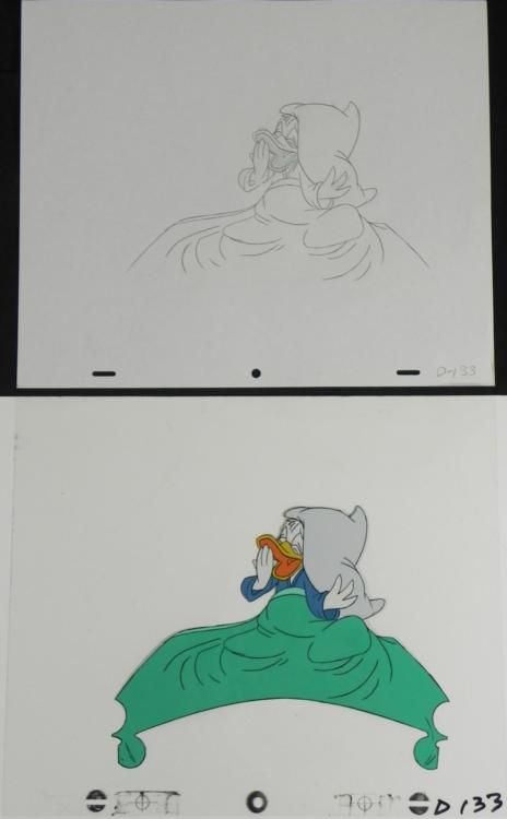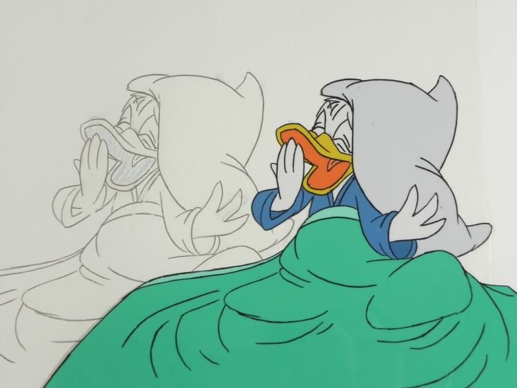 Donald Fauntleroy Duck is a cartoon character created in 1934 at Walt * Disney Productions. Donald is an anthropomorphic white duck with a * yellow-orange bill, legs, and feet. He typically wears a sailor suit * with a cap and a black or red bow tie. Donald * is most famous for his semi-intelligible speech and his mischievous and * irritable personality. Along with his friend Mickey Mouse, Donald is * one of the most popular Disney characters and was included in TV Guide's * list of the 50 greatest cartoon characters * of all time in 2002. * * Alright Donald, you can do this, just put your head down and just fall asleep... * Original Animation Cel and * DrawingOriginal "rough" drawing in black and * non-photo blue pencil with the notations in blackOverall size is a 12-field drawing that is 10 * 1/2" x 12 1/2"Size of cel: 10 1/2" x 12 * 1/2"Overall condition: Cel- Excellent & Drawing- Very good; spot of surface wear to the paper * This is * an original hand-painted cel used in * the production of an episode of "Donald Duck." Each cel represents a * slight change in position of the characters. When individually * photographed and projected in rapid succession, the images * appear to move. To * create production cels, the original animator's drawing is transferred * onto an acetate cel (by hand-inking and/or photo copying). The cel is * then hand-painted on the reverse side. * * * * The drawing and cel are ready to be matted and * framed. The notations are located at the bottom of * both.