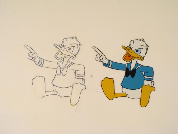 Don't do that!!!!! * * * * * Original Animation Cel & DrawingMedium: Hand painted acetate celDetails: Animation notations and peg holes * * Original "rough" animation drawing, in non-photo blue and black pencil * * Size of cel: 10 1/2 x 12 1/2 inchesSize of drawing: 10 1/2 x 12 1/2 inches * * Condition: Very good; drawing has some erase marks * * * This is an original hand-painted cel set-up used in the production of the "Walt Disney Shows." Each one-of-a-kind set-up represents a slight change in position of the characters. When individually photographed and projected in rapid succession, the images appear * to move. To created production cels, the original animator's drawing is transferred onto an acetate cel (by hand-inking and/or photo copying). The cel is then hand-painted on the reverse side. * * * * * Traditional animation is a multi-step process which includes various types of art techniques. Drawings are a key part of the process, in which the animator creates the design and movement of the characters. Drawings are then transferred onto acetate cels * (by hand-inking and/or photo copying) to create a production cel, which is then hand painted on the back side, using paint colors chosen and approved by the creator of the series.