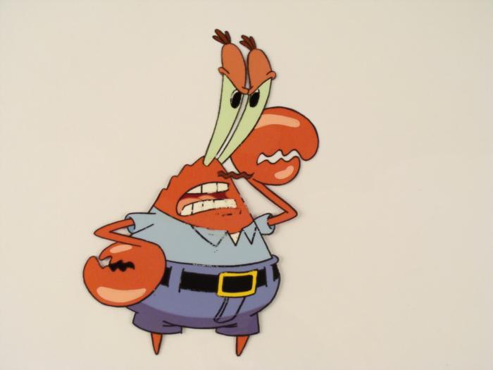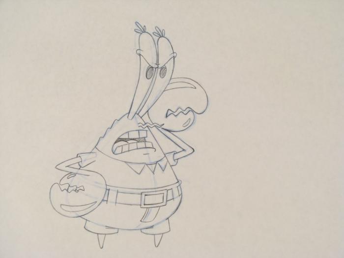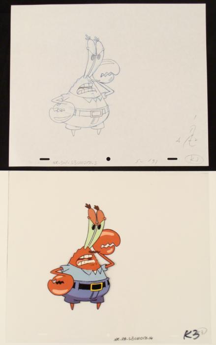 This original animation cel is from the Nickelodeon TV show SpongeBob Squarepants. The story takes place under the deep blue sea in Bikini Bottom, where SpongeBob resides. SpongeBob, who is a yellow, porous sponge, is your typical happy-go-lucky character, as he is always cheerful and enjoys making people laugh. Patrick Star, SpongeBob's neighbor who is a starfish, is your average children's show idiot, as he boasts knowing nothing and is often getting himself into ridiculous situations. Between the homes of these two lies the home of the miserable Squidward, a squid, who is known for being grouchy and playing tricks on SpongeBob and Patrick. Both SpongeBob and Squidward work at the Krusty Krab, a fast food business run by the greedy money-loving Mr. Krabs, a crab, the arch rival of the evil, possibly misunderstood, Plankton. Another neighbor, Sandy Cheeks, an athletic squirrel who normally wears an astronaut's space suit, was introduced in "Tea at the Treedome." She spends most of her time inventing and experimenting. Mr. Krabs looks very irritated.Original Production Animated Cel and Drawing Original "rough" animation drawing, in black and non-photo blue pencil, with notations in black. Overall Size of Drawing: 10 1/2" x 12 1/2" Overall Size of Cel: 10 1/2" x 12 1/2" Very Good ConditionThis is an original hand-painted cel set-up used in the production of an episode of "SpongeBob SquarePants." Each one-of-a-kind set-up represents a slight change in position of the characters. When individually photographed and projected in rapid succession, the images appear to move.