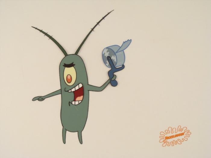 This original animation cel is from the Nickelodeon TV show SpongeBob Squarepants. The story takes place under the deep blue sea in Bikini Bottom, where SpongeBob resides. SpongeBob, who is a yellow, porous sponge, is your typical happy-go-lucky character, as he is always cheerful and enjoys making people laugh. Patrick Star, SpongeBob's neighbor who is a starfish, is your average children's show idiot, as he boasts knowing nothing and is often getting himself into ridiculous situations. Between the homes of these two lies the home of the miserable Squidward, a squid, who is known for being grouchy and playing tricks on SpongeBob and Patrick. Both SpongeBob and Squidward work at the Krusty Krab, a fast food business run by the greedy money-loving Mr. Krabs, a crab, the arch rival of the evil, possibly misunderstood, Plankton. Another neighbor, Sandy Cheeks, an athletic squirrel who normally wears an astronaut's space suit, was introduced in "Tea at the Treedome." She spends most of her time inventing and experimenting. Shown here is Plankton pointing down.Original Production Animated Cel and Drawing Original "rough" animation drawing, in black and red pencil, with notations in black and red. Overall Size of Drawing: 10 1/2" x 12 1/2" Overall Size of Cel: 10 1/2" x 12 1/2" Very Good ConditionThis is an original hand-painted cel set-up used in the production of an episode of "SpongeBob SquarePants." Each one-of-a-kind set-up represents a slight change in position of the characters. When individually photographed and projected in rapid succession, the images appear to move.