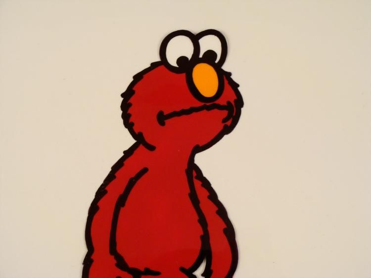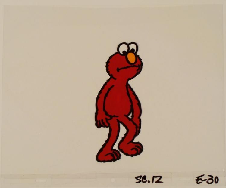 In Elmo's world everyone is happy and full of laughter. Elmo enjoys making friends and having a good time. In the cel, Elmo is looking down and the ground * * * Original Animation Cel * * Medium: Hand painted acetate celDetails: Animation notations and peg holes * * Size of cel: 10 1/2 x 12 1/2 inchesCondition: Very good * * * This is an original hand-painted cel set-up used in the production of an episode of "Sesame Street." Each one-of-a-kind set-up represents a slight change in position of the characters. When individually photographed and projected in rapid succession, the * images appear to move. * * To create production cels, the original animator's drawing is transferred onto an acetate cel (by hand-inking and/or photo copying). The cel is then hand-painted on the reverse side. * * * *