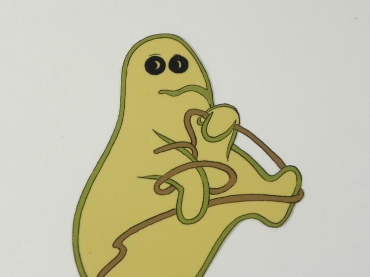 The Herculoids battled to defend their planet from menaces on Amzot/Quasar and from outer space. All of the Herculoids displayed Human-level intelligence - employing precision teamwork and complex tactics - as well as emotions, and Zandor and Tara both displayed a working knowledge of complex alien technologies as well as the ability to pilot interstellar spacecraft-but essentially, Zandor, Tara, Dorno, and the Herculoids were fighting to keep Amzot/Quasar a technology-free, primitive planet. This is further indicated by the pseudo-barbarian outfits of Zandor, Tara, and Dorno and the fact that technology was used mainly by the various villains, but rarely if ever by the heroes. Although the "speech" of their companions was limited and repetitive, Zandor, Tara and Dorno demonstrated that Gloop and Gleep, at least, had a comprehensive mode of communication, and that they could at least understand and interpret this language. **The cel is at least 35 years old.Stupid Gloop... Always getting tangled in this darn rope... Stay away me, stay away... Original Animation CelSize of cel: 10 1/2" x 12 1/2"Excellent conditionThis is an original hand-painted cel set-up used in the production of an episode of "Herculoids." Each one-of-a-kind set-up represents a slight change in position of the characters. When individually photographed and projected in rapid succession, the images appear to move. To create production cels, the original animator's drawing is transferred onto an acetate cel (by hand-inking and/or photo copying). The cel is then hand-painted on the reverse side. The cel is ready to be matted and framed. The notations are located at the bottom of the cel.