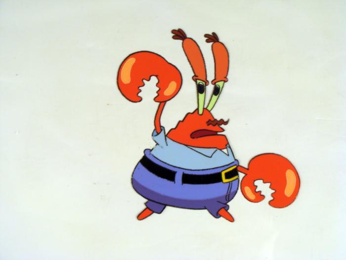 This original animation cel is from the Nickelodeon TV show SpongeBob Squarepants. The story takes place under the deep blue sea in Bikini Bottom, where SpongeBob resides. SpongeBob, who is a yellow, porous sponge, is your typical happy-go-lucky character, as he is always cheerful and enjoys making people laugh. Patrick Star, SpongeBob's neighbor who is a starfish, is your average children's show idiot, as he boasts knowing nothing and is often getting himself into ridiculous situations. Between the homes of these two lies the home of the miserable Squidward, a squid, who is known for being grouchy and playing tricks on SpongeBob and Patrick. Both SpongeBob and Squidward work at the Krusty Krab, a fast food business run by the greedy money-loving Mr. Krabs, a crab, the arch rival of the evil, possibly misunderstood, Plankton. Another neighbor, Sandy Cheeks, an athletic squirrel who normally wears an astronaut's space suit, was introduced in "Tea at the Treedome." She spends most of her time inventing and experimenting. Mr. Krabs appears to be displeased with someone or something. Original Production Animated Cel Overall Size of Cel: 10 1/2" x 20 1/2" Very Good ConditionThis is an original hand-painted cel set-up used in the production of an episode of "SpongeBob SquarePants." Each one-of-a-kind set-up represents a slight change in position of the characters. When individually photographed and projected in rapid succession, the images appear to move.