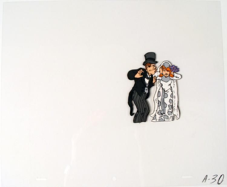 This is an original animation cel of a bride and groom. * * * * You had to go there didn't you, you just had to do it!! * * * Medium: Hand painted acetate cel * * Cel size: 10 1/2" x 12 1/2" * * Notations: Bottom of cel * * Condition: Excellent