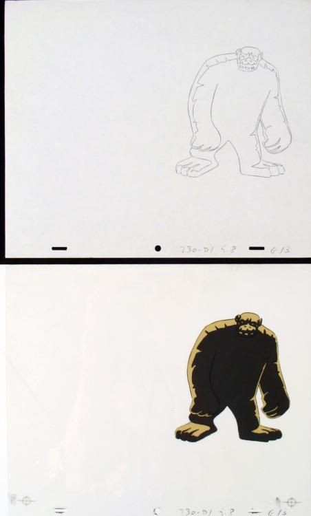 The Herculoids battled to defend their planet from menaces on Amzot/Quasar and from outer space. All of the Herculoids displayed Human-level intelligence - employing precision teamwork and complex tactics - as well as emotions, and Zandor and Tara both * displayed a working knowledge of complex alien technologies as well as the ability to pilot interstellar spacecraft—but essentially, Zandor, Tara, Dorno, and the Herculoids were fighting to keep Amzot/Quasar a technology-free, primitive planet. This is further * indicated by the pseudo-barbarian outfits of Zandor, Tara, and Dorno and the fact that technology was used mainly by the various villains, but rarely if ever by the heroes. Although the "speech" of their companions was limited and repetitive, Zandor, Tara * and Dorno demonstrated that Gloop and Gleep, at least, had a comprehensive mode of communication, and that they could at least understand and interpret this language. * * * * **The cel and drawing are at least 35 years old. * * * * Don't mess with Igoo, because his bark is definitely worse than his bite. * * * Original Animation and Drawing * * Original "rough" animation drawing, in black pencil with the notations in black. * * * Overall Size of Drawing: 10 1/2" x 12 1/2" * Overall Size of the Cel: 10 1/2" x 12 1/2" * Excellent condition * This is an original hand-painted cel set-up used in the production of an episode of "Herculoids." Each one-of-a-kind set-up represents a slight change in position of the characters. When individually photographed and projected in rapid succession, the images * appear to move. * * To create production cels, the original animator's drawing is transferred onto an acetate cel (by hand-inking and/or photo copying). The cel is then hand-painted on the reverse side. * * The cel and drawing received by the winning bidder may be ever so slightly different from that in the auction photos. * * * * The drawing and cel are ready to be matted and framed. The notations are located at the bottom of the drawing and cel. * *