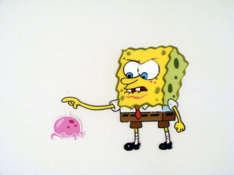 This original animation cel is from the Nickelodeon TV show SpongeBob Squarepants. The story takes place under the deep blue sea in Bikini Bottom, where SpongeBob resides. SpongeBob, who is a yellow, porous sponge, is your typical happy-go-lucky character, * as he is always cheerful and enjoys making people laugh. Patrick Star, SpongeBob's neighbor who is a starfish, is your average children's show idiot, as he boasts knowing nothing and is often getting himself into ridiculous situations. Between the homes of * these two lies the home of the miserable Squidward, a squid, who is known for being grouchy and playing tricks on SpongeBob and Patrick. Both SpongeBob and Squidward work at the Krusty Krab, a fast food business run by the greedy money-loving Mr. Krabs, a * crab, the arch rival of the evil, possibly misunderstood, Plankton. Another neighbor, Sandy Cheeks, an athletic squirrel who normally wears an astronaut's space suit, was introduced in "Tea at the Treedome." She spends most of her time inventing and experimenting. * * I have had enough our nonsense, now leave me alone! * * * * * Original Production Animated Cel Overall Size of Cel: 10 1/2" x 12 1/2" Very Good Condition * This is an original hand-painted cel was used in the production of an episode of "SpongeBob SquarePants." Each one-of-a-kind cel * represents a slight change in position of the characters. When individually photographed and projected in rapid succession, the images appear to move. * * To create production cels, the original animator's drawing is transferred onto an acetate cel (by hand-inking and/or photo copying). The cel is then hand-painted on the reverse side. * * * The cel is ready to be matted and framed. The animator's notations are at the bottom of the cel. There is some slight paint fade to Spongebob's outline. * * *