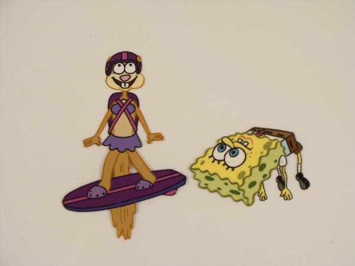 This original animation cel is from the Nickelodeon TV show SpongeBob Squarepants. The story takes place under the deep blue sea in Bikini Bottom, where SpongeBob resides. SpongeBob, who is a yellow, porous sponge, is your typical happy-go-lucky character, as he is always cheerful and enjoys making people laugh. Patrick Star, SpongeBob's neighbor who is a starfish, is your average children's show idiot, as he boasts knowing nothing and is often getting himself into ridiculous situations. Between the homes of these two lies the home of the miserable Squidward, a squid, who is known for being grouchy and playing tricks on SpongeBob and Patrick. Both SpongeBob and Squidward work at the Krusty Krab, a fast food business run by the greedy money-loving Mr. Krabs, a crab, the arch rival of the evil, possibly misunderstood, Plankton. Another neighbor, Sandy Cheeks, an athletic squirrel who normally wears an astronaut's space suit, was introduced in "Tea at the Treedome." She spends most of her time inventing and experimenting. Just let the wind take you...Original Production Animated Cel Overall Size of Cel: 10 1/2" x 12 1/2" Very Good ConditionThis is an original hand-painted cel set-up used in the production of an episode of "SpongeBob SquarePants." Each one-of-a-kind set-up represents a slight change in position of the characters. When individually photographed and projected in rapid succession, the images appear to move.