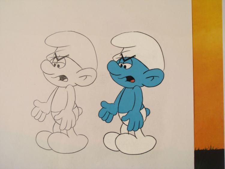 This Smurf looks unhappy. * * * Original Animation Cel & Printed Background & Drawing * * Medium: Hand painted acetate celDetails: Animation notations and peg holes * * Size of cel: 10 1/2 x 12 1/2 inchesSize of background: 11 x 17 inchesSize of drawing: 10 1/2 x 12 1/2 inches * * Condition: Very good * * * This is an original hand-painted cel set-up used in the production of an episode of "The Smurfs." Each one-of-a-kind set-up represents a slight change in position of the characters. When individually photographed and projected in rapid succession, the images * appear to move. * * To create production cels, the original animator's drawing is transferred onto an acetate cel (by hand-inking and/or photo copying). The cel is then hand-painted on the reverse side. The background accompanying this set-up is a printed reproduction background. * * * * * * * Traditional animation is a multi-step process which includes various types of art techniques. Drawings are a key part of the process, in which the animator creates the design and movement of the characters. Drawings are then transferred onto acetate cels * (by hand-inking and/or photo copying) to create a production cel, which is then hand painted on the back side, using paint colors chosen and approved by the creator of the series. * *
