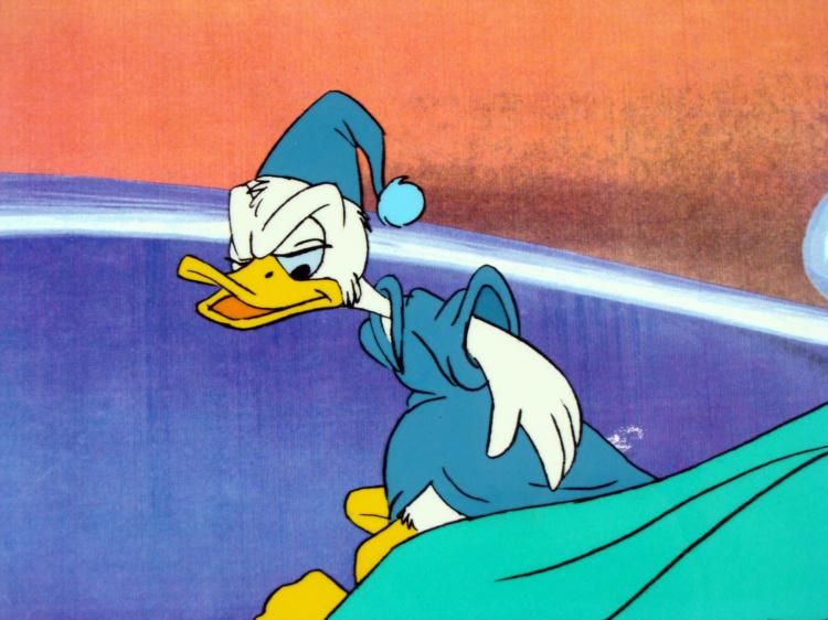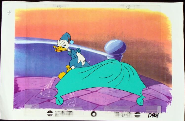 Donald Duck is a cartoon character created in 1934 at Walt Disney Productions. Donald is an anthropomorphic white duck with a yellow-orange bill, legs, and feet. He typically wears a sailor suit with a cap and a black or red bow tie. Donald is most famous * for his semi-intelligible speech and his mischievous and irritable personality. Along with his friend Mickey Mouse, Donald is one of the most popular Disney characters and was included in TV Guide's list of the 50 greatest cartoon characters of all time in * 2002. You got me up for what?? The background that accompanies this cel doesn't correspond to the episode the cel is from. * Printed Background and Animated Cel Overall Size of Background: 11" x 17" Overall Size of the Cel: 10 1/2" x 12 1/2" Very Good Condition * This is an original hand-painted cel was used in the production of an episode of "Donald Duck." Each cel represents a slight change in position of the characters. When individually photographed and projected in rapid succession, the images appear to move. * To create production cels, the original animator's drawing is transferred onto an acetate cel (by hand-inking and/or photo copying). The cel is then hand-painted on the reverse side. The background accompanying this set-up is a reproduction background. * * * The background and cel are ready to be matted and framed. The animators notations are located at the bottom of the cel and at the top of the background. There is some creasing and paint residue on the background.