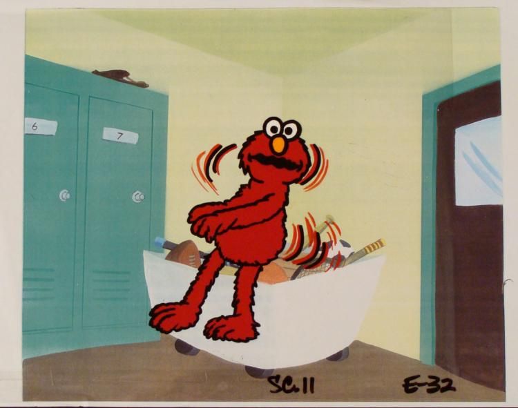 In Elmo's world everyone is happy and full of laughter. Elmo enjoys making friends and having a good time. In the cel, Elmo is going to play some sports * * * Original Animation Cel & Printed Background * * Medium: Hand painted acetate celDetails: Animation notations and peg holes * * Size of cel: 10 1/2 x 12 1/2 inchesSize of background: 11 x 17 inches * * Condition: Very good * * * This is an original hand-painted cel set-up used in the production of an episode of "Sesame Street." Each one-of-a-kind set-up represents a slight change in position of the characters. When individually photographed and projected in rapid succession, the * images appear to move. * * To create production cels, the original animator's drawing is transferred onto an acetate cel (by hand-inking and/or photo copying). The cel is then hand-painted on the reverse side. The background accompanying this set-up is a printed reproduction background. * *