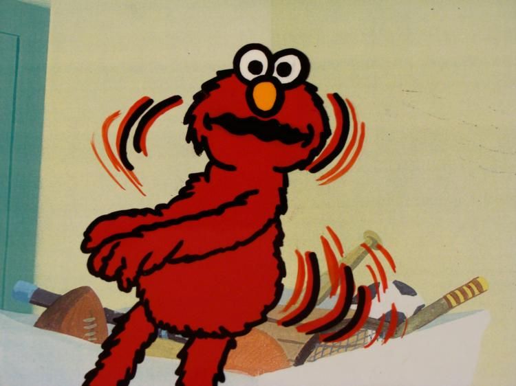 In Elmo's world everyone is happy and full of laughter. Elmo enjoys making friends and having a good time. In the cel, Elmo is going to play some sports * * * Original Animation Cel & Printed Background * * Medium: Hand painted acetate celDetails: