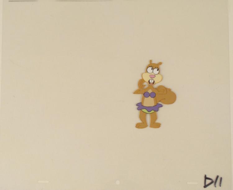This original animation cel is from the Nickelodeon TV show SpongeBob Squarepants. The story takes place under the deep blue sea in Bikini Bottom, where SpongeBob resides. SpongeBob, who is a yellow, porous sponge, is your typical happy-go-lucky character, as he is always cheerful and enjoys making people laugh. Patrick Star, SpongeBob's neighbor who is a starfish, is your average children's show idiot, as he boasts knowing nothing and is often getting himself into ridiculous situations. Between the homes of these two lies the home of the miserable Squidward, a squid, who is known for being grouchy and playing tricks on SpongeBob and Patrick. Both SpongeBob and Squidward work at the Krusty Krab, a fast food business run by the greedy money-loving Mr. Krabs, a crab, the arch rival of the evil, possibly misunderstood, Plankton. Another neighbor, Sandy Cheeks, an athletic squirrel who normally wears an astronaut's space suit, was introduced in "Tea at the Treedome." She spends most of her time inventing and experimenting. * Yoda-lay-ee-hoo!! * Original Production Animated Cel Overall Size of Cel: 10 1/2" x 12 1/2" Very Good Condition This is an original hand-painted cel set-up used in the production of an episode of "SpongeBob SquarePants." Each one-of-a-kind set-up represents a slight change in position of the characters. When individually photographed and projected in rapid succession, the images appear to move. * To create production cels, the original animator's drawing is transferred onto an acetate cel (by hand-inking and/or photo copying). The cel is then hand-painted on the reverse side. * The cel is ready to be matted and framed. The animator's notations are at the bottom of the cel. There is some slight paint fade to Sandy's outline. *
