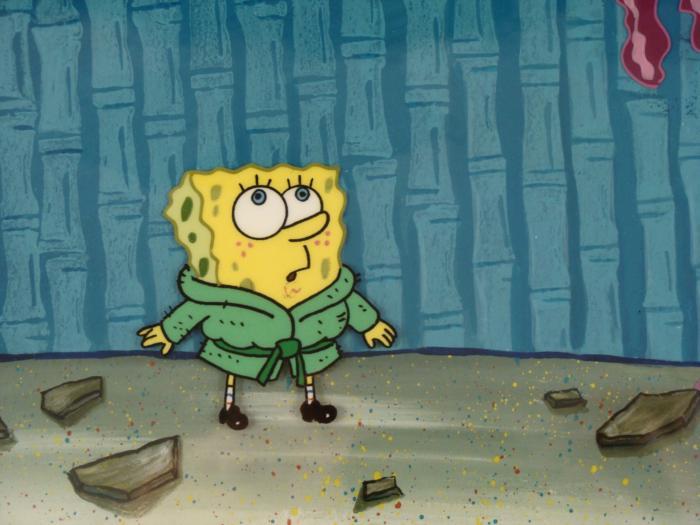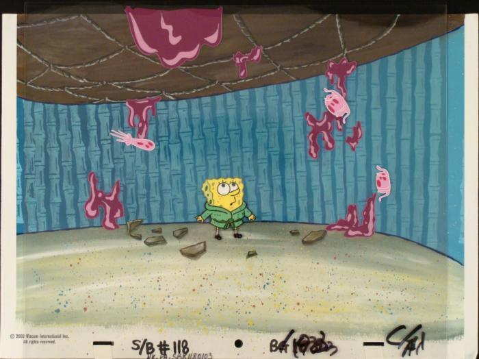 This original hand-painted background and animation cel are from the Nickelodeon TV show SpongeBob Squarepants. The story takes place under the deep blue sea in Bikini Bottom, where SpongeBob resides. SpongeBob, who is a yellow, porous sponge, is your typical happy-go-lucky character, as he is always cheerful and enjoys making people laugh. Patrick Star, SpongeBob's neighbor who is a starfish, is your average children's show idiot, as he boasts knowing nothing and is often getting himself into ridiculous situations. Between the homes of these two lies the home of the miserable Squidward, a squid, who is known for being grouchy and playing tricks on SpongeBob and Patrick. Both SpongeBob and Squidward work at the Krusty Krab, a fast food business run by the greedy money-loving Mr. Krabs, a crab, the arch rival of the evil, possibly misunderstood, Plankton. Another neighbor, Sandy Cheeks, an athletic squirrel who normally wears an astronaut's space suit, was introduced in "Tea at the Treedome." She spends most of her time inventing and experimenting. SpongeBob's in trouble!!!Original Production Background and Animated Cel Overall Size of Background: 10 1/2" x 14" Overall Size of the Cel: 10 1/2" x 12 1/2" Very good condition This is an original hand-painted cel set-up used in the production of an episode of "SpongeBob SquarePants." Each one-of-a-kind set-up represents a slight change in position of the characters. When individually photographed and projected in rapid succession, the images appear to move.