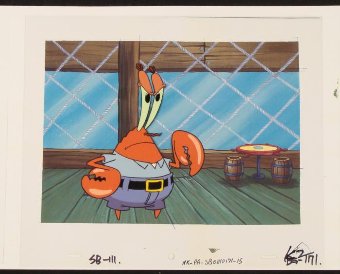 This animation cel and reproduction background are from the Nickelodeon TV show SpongeBob Squarepants. The story takes place under the deep blue sea in Bikini Bottom, where SpongeBob resides. SpongeBob, who is a yellow, porous sponge, is your typical happy-go-lucky character, as he is always cheerful and enjoys making people laugh. Patrick Star, SpongeBob's neighbor who is a starfish, is your average children's show idiot, as he boasts knowing nothing and is often getting himself into ridiculous situations. Between the homes of these two lies the home of the miserable Squidward, a squid, who is known for being grouchy and playing tricks on SpongeBob and Patrick. Both SpongeBob and Squidward work at the Krusty Krab, a fast food business run by the greedy money-loving Mr. Krabs, a crab, the arch rival of the evil, possibly misunderstood, Plankton. Another neighbor, Sandy Cheeks, an athletic squirrel who normally wears an astronaut's space suit, was introduced in "Tea at the Treedome." She spends most of her time inventing and experimenting. What is bugging Mr. Krabs?Original Printed Background and Animated Cel Overall Size of Background: 11" x 17" Overall Size of the Cel: 10 1/2" x 12 1/2" Very good condition; it has been storedThis is an original hand-painted cel set-up used in the production of an episode of "SpongeBob SquarePants." Each one-of-a-kind set-up represents a slight change in position of the characters. When individually photographed and projected in rapid succession, the images appear to move.
