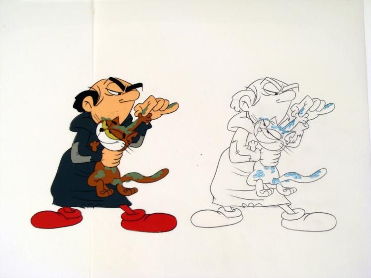 Classic Saturday-morning cartoon series featuring magical blue elf-like creatures called Smurfs. The Smurfs, named for their personalities, inhabit a village of mushroom houses in an enchanted forest. These loveable creatures are led by Papa Smurf and * live carefree... except for one major threat to their existance: Gargamel, an evil but inept wizard who lives in a stone-built house in the forest; and his feline companion, the equally nasty Azrael. Typical stories deal with the Smurfs' efforts to fight off * Gargamel, who wanted to do one of several things to the blue creatures including eat them, make them slaves and gain their magical secrets in order to gain dignity among the wizard's fraternity. More than once, the Smurfs had to save Gargamel from his back-firing * plans or even eviler wizard. * * * * Good Azrael, good Azrael, you have made daddy proud... There is matching cel overlay that accompanies the cel. * * * Original Animated Cel and DrawingOriginal "rough" animation drawing, in black pencil with the notations in black pencil * Overall size is a 12-field drawing that is 10 1/2" × 12 1/2" * Overall Size of Cel: 10 1/2" x 12 1/2" * * Excellent Condition * * * * * * * This is an original hand-painted cel set-up used in an episode of "The Smurfs." Each one-of-a-kind cel represents a slight change in position of the characters. When individually photographed and projected in rapid succession, the images appear to move. * * To create production cels, the original animator's drawing is transferred onto an acetate cel (by hand-inking and/or photo copying). The cel is then hand-painted on the reverse side. * * * * * The cel and drawing are ready to be matted and framed. The animator's notations are shown at the bottom of both. * *
