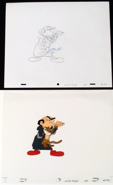 Classic Saturday-morning cartoon series featuring magical blue elf-like creatures called Smurfs. The Smurfs, named for their personalities, inhabit a village of mushroom houses in an enchanted forest. These loveable creatures are led by Papa Smurf and * live carefree... except for one major threat to their existance: Gargamel, an evil but inept wizard who lives in a stone-built house in the forest; and his feline companion, the equally nasty Azrael. Typical stories deal with the Smurfs' efforts to fight off * Gargamel, who wanted to do one of several things to the blue creatures including eat them, make them slaves and gain their magical secrets in order to gain dignity among the wizard's fraternity. More than once, the Smurfs had to save Gargamel from his back-firing * plans or even eviler wizard. * * * * Good Azrael, good Azrael, you have made daddy proud... There is matching cel overlay that accompanies the cel. * * * Original Animated Cel and DrawingOriginal "rough" animation drawing, in black pencil with the notations in black pencil * Overall size is a 12-field drawing that is 10 1/2" × 12 1/2" * Overall Size of Cel: 10 1/2" x 12 1/2" * * Excellent Condition * * * * * * * This is an original hand-painted cel set-up used in an episode of "The Smurfs." Each one-of-a-kind cel represents a slight change in position of the characters. When individually photographed and projected in rapid succession, the images appear to move. * * To create production cels, the original animator's drawing is transferred onto an acetate cel (by hand-inking and/or photo copying). The cel is then hand-painted on the reverse side. * * * * * The cel and drawing are ready to be matted and framed. The animator's notations are shown at the bottom of both. * *