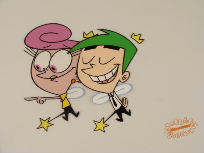 This original animation cel is from the Nickelodeon TV show Fairly Odd Parents. Timmy Turner is a short, buck-toothed 10-year-old boy with a pink cap who lives in Dimmsdale, a small suburban town with his dim-witted parents. His life is constantly miserable, due to the fact that his parents are rarely home and he is babysat by an incredibly evil teenager, Vicky, and that, generally, no one understands him (as indicated by the show's theme song). But everything changes when he receives two fairy parents: Cosmo and his wife, Wanda and later, their son Poof. Timmy learns that his fairy godparents are capable of granting him any wish he wants within certain limits. However, Timmy's immature nature causes him to sometimes ask for wishes that unintentionally result in disaster, and he and his fairy parents and fairy brother must find a way to "unwish" the wish.Original Production Animated Cel Overall Size of Cel: 10 1/2" x 12 1/2" Very Good ConditionThis is an original hand-painted cel set-up used in the production of an episode of "Fairly Odd Parents." Each one-of-a-kind set-up represents a slight change in position of the characters. When individually photographed and projected in rapid succession, the images appear to move.