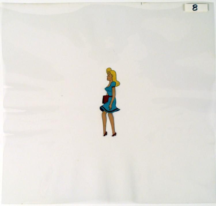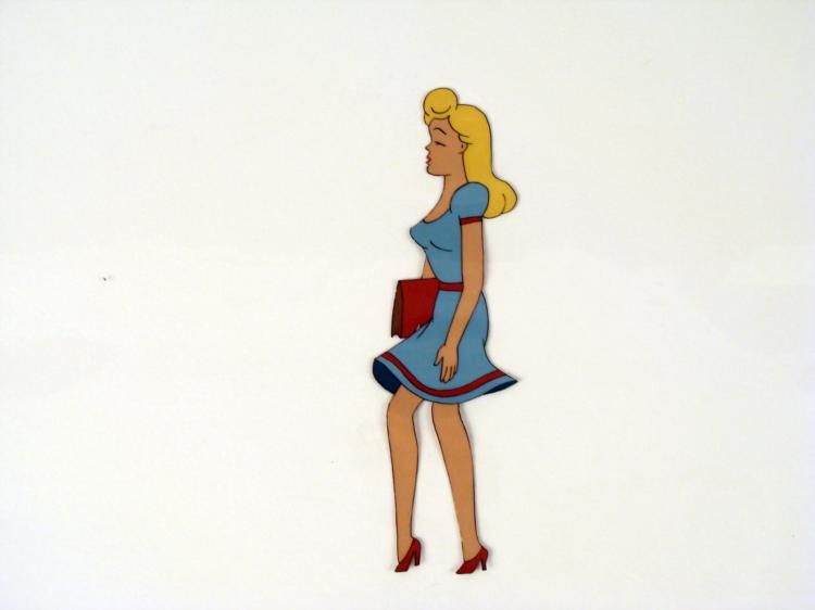 This is an original animation cel a blonde woman. * * * * I better hurry up, I don't want to be late for my first day of work... * * * Medium: Hand painted acetate cel * * Cel size: 13 1/2" x 14" * * Condition: Very good; been stored