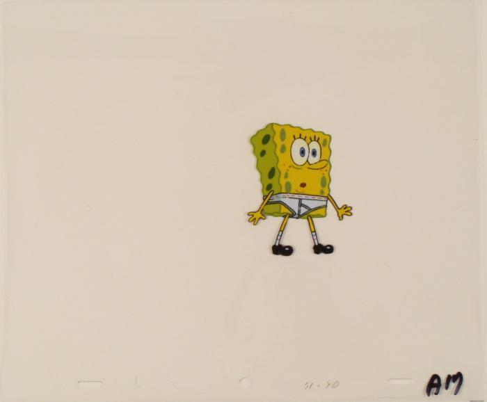 This original animation cel is from the Nickelodeon TV show SpongeBob Squarepants. The story takes place under the deep blue sea in Bikini Bottom, where SpongeBob resides. SpongeBob, who is a yellow, porous sponge, is your typical happy-go-lucky character, as he is always cheerful and enjoys making people laugh. Patrick Star, SpongeBob's neighbor who is a starfish, is your average children's show idiot, as he boasts knowing nothing and is often getting himself into ridiculous situations. Between the homes of these two lies the home of the miserable Squidward, a squid, who is known for being grouchy and playing tricks on SpongeBob and Patrick. Both SpongeBob and Squidward work at the Krusty Krab, a fast food business run by the greedy money-loving Mr. Krabs, a crab, the arch rival of the evil, possibly misunderstood, Plankton. Another neighbor, Sandy Cheeks, an athletic squirrel who normally wears an astronaut's space suit, was introduced in "Tea at the Treedome." She spends most of her time inventing and experimenting. Spongebob doesn't appears to know what to do next, standing their motionless.Original Production Animated Cel Overall Size of Cel: 10 1/2" x 12 1/2" Very Good ConditionThis is an original hand-painted cel set-up used in the production of an episode of "SpongeBob SquarePants." Each one-of-a-kind set-up represents a slight change in position of the characters. When individually photographed and projected in rapid succession, the images appear to move.