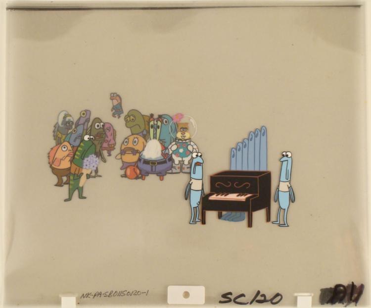 This original animation cel is from the Nickelodeon TV show SpongeBob Squarepants. The story takes place under the deep blue sea in Bikini Bottom, where SpongeBob resides. SpongeBob, who is a yellow, porous sponge, is your typical happy-go-lucky character, as he is always cheerful and enjoys making people laugh. Patrick Star, SpongeBob's neighbor who is a starfish, is your average children's show idiot, as he boasts knowing nothing and is often getting himself into ridiculous situations. Between the homes of these two lies the home of the miserable Squidward, a squid, who is known for being grouchy and playing tricks on SpongeBob and Patrick. Both SpongeBob and Squidward work at the Krusty Krab, a fast food business run by the greedy money-loving Mr. Krabs, a crab, the arch rival of the evil, possibly misunderstood, Plankton. Another neighbor, Sandy Cheeks, an athletic squirrel who normally wears an astronaut's space suit, was introduced in "Tea at the Treedome." She spends most of her time inventing and experimenting. * This cel is from the episode titled Squidward, The Unfriendly Ghost. Some members of Bikini Bottom appear to mourning the passing of Squidward. * Original Production Animated Cel Overall Size of Cel: 10 1/2" x 12 1/2" Excellent Condition This is an original hand-painted cel set-up used in the production of an episode of "SpongeBob SquarePants." Each one-of-a-kind set-up represents a slight change in position of the characters. When individually photographed and projected in rapid succession, the images appear to move. * To create production cels, the original animator's drawing is transferred onto an acetate cel (by hand-inking and/or photo copying). The cel is then hand-painted on the reverse side. * The cel received by the winning bidder may be ever so slightly different from the one in the auction photos. * The cel is ready to be matted and framed. The animator's notations are at the bottom of the cel. The cel comes with eight different layers, with a total of fifteen characters, taped together at the bottom. *