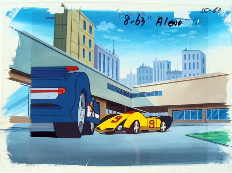 Speed Racer is a show featuring a young racer named Speed and his ultimate driving machine, the Mach 5. Speed Racer combines racing with international intrigue. Speed is an eighteen year old car driver, and is one of the youngest in the international * racing cicuit. Speed also has martial art talents and tried to do the right thing whenever possible. Trixie is Speed's girlfriend, she is a seventeen year old pilot of airplanes and helicopters and often rides along as Speed's assistant and navigator. Racer * X (Rex Racer) is Speed's older brother, who left home years before after a dispute with Pops over a crashed car. He eventually became one of the world's best drivers and a secret agent for the International Secret Service. Spritle is Speed's little brother * and turned eight years of age in the episode "The Royal Racer." Spritle and Chim Chim usually always follow along Trixie and Speed in the trunk of their Mach 5 car. Chim Chim is the family's pet chimpanzee, and Spritle's best friend. Chim Chim makes it his * duty that Trixie and Speed get home safely. * * * * Here it looks some of the cars are getting ready for another big race. * * * Original Production Background and Animated Cel * Overall Size of Background: 10" x 13 1/2" Overall Size of the Cel: 9" x 10 1/2" Very Good Condition; been stored * * * This is an original hand-painted cel set-up used in the production of an episode of "Speed Racer." Each one-of-a-kind set-up represents a slight change in position of the characters. When individually photographed and projected in rapid succession, the images * appear to move. * * To create production cels, the original animator's drawing is transferred onto an acetate cel (by hand-inking and/or photo copying). The cel is then hand-painted on the reverse side. The background accompanying this set-up is a hand-painted original production * background. * * The background and cel are ready to be matted and framed. It is a colored background with a cel and has the animator's notations at the top of both. There is a small rip at the bottom of the background. *