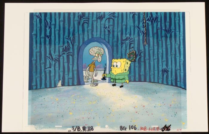 To create production cels, the original animator's drawing is transferred onto an acetate cel (by hand-inking and/or photo copying). The cel is then hand-painted on the reverse side. The printed background is ready to be matted and framed. It is a colored background with a cel and has the animator's notations at the bottom of the background and the cel. The background is a printed reproduction background. There is some slight paint fade to SpongeBob's outline. The cel has multiple layers; first is SpongeBob and the second cel is Squidward.