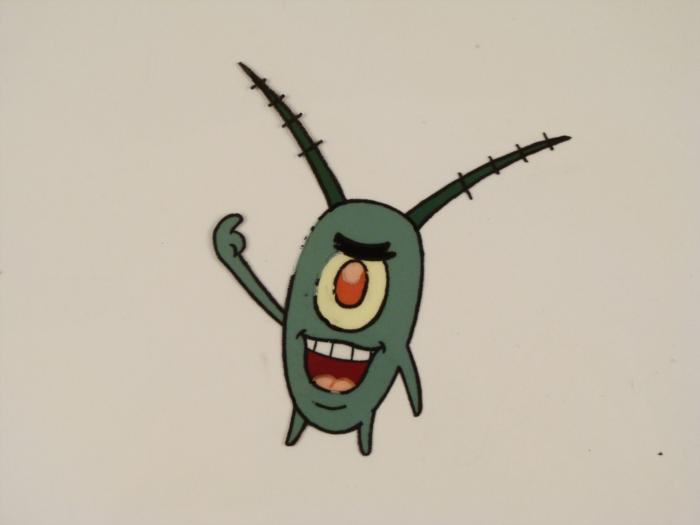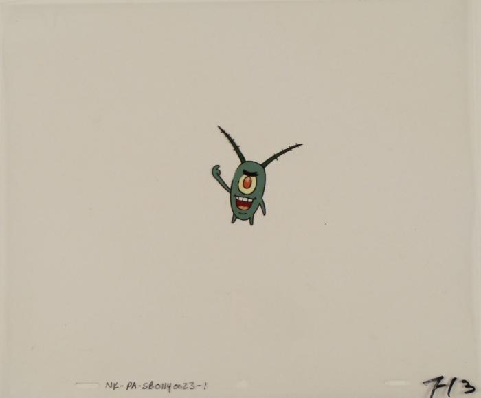 This original animation cel is from the Nickelodeon TV show SpongeBob Squarepants. The story takes place under the deep blue sea in Bikini Bottom, where SpongeBob resides. SpongeBob, who is a yellow, porous sponge, is your typical happy-go-lucky character, as he is always cheerful and enjoys making people laugh. Patrick Star, SpongeBob's neighbor who is a starfish, is your average children's show idiot, as he boasts knowing nothing and is often getting himself into ridiculous situations. Between the homes of these two lies the home of the miserable Squidward, a squid, who is known for being grouchy and playing tricks on SpongeBob and Patrick. Both SpongeBob and Squidward work at the Krusty Krab, a fast food business run by the greedy money-loving Mr. Krabs, a crab, the arch rival of the evil, possibly misunderstood, Plankton. Another neighbor, Sandy Cheeks, an athletic squirrel who normally wears an astronaut's space suit, was introduced in "Tea at the Treedome." She spends most of her time inventing and experimenting. Plankton has a big smile.Original Production Animated Cel Overall Size of Cel: 10 1/2" x 12 1/2" Very Good ConditionThis is an original hand-painted cel set-up used in the production of an episode of "SpongeBob SquarePants." Each one-of-a-kind set-up represents a slight change in position of the characters. When individually photographed and projected in rapid succession, the images appear to move.