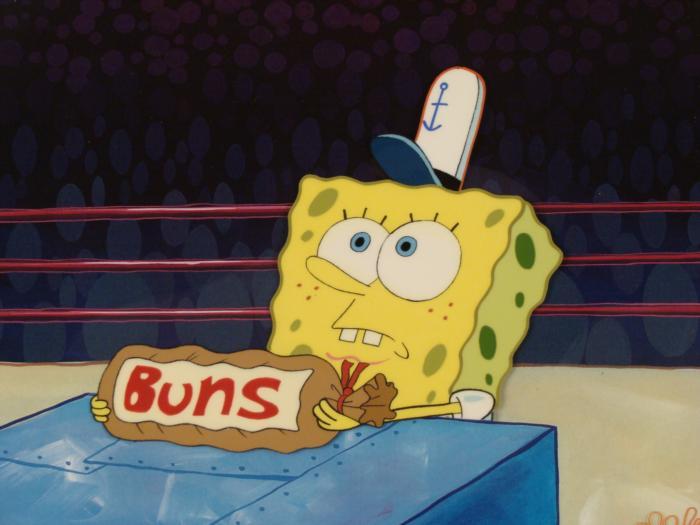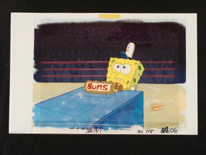 This animation cel and reproduction background are from the Nickelodeon TV show SpongeBob Squarepants. The story takes place under the deep blue sea in Bikini Bottom, where SpongeBob resides. SpongeBob, who is a yellow, porous sponge, is your typical happy-go-lucky character, as he is always cheerful and enjoys making people laugh. Patrick Star, SpongeBob's neighbor who is a starfish, is your average children's show idiot, as he boasts knowing nothing and is often getting himself into ridiculous situations. Between the homes of these two lies the home of the miserable Squidward, a squid, who is known for being grouchy and playing tricks on SpongeBob and Patrick. Both SpongeBob and Squidward work at the Krusty Krab, a fast food business run by the greedy money-loving Mr. Krabs, a crab, the arch rival of the evil, possibly misunderstood, Plankton. Another neighbor, Sandy Cheeks, an athletic squirrel who normally wears an astronaut's space suit, was introduced in "Tea at the Treedome." She spends most of her time inventing and experimenting. Why does SpongeBob have buns?Original Printed Background and Animated Cel Overall Size of Background: 10 1/2" x 17" Overall Size of the Cel: 10 1/2" x 12 1/2" Very good conditionThis is an original hand-painted cel set-up used in the production of an episode of "SpongeBob SquarePants." Each one-of-a-kind set-up represents a slight change in position of the characters. When individually photographed and projected in rapid succession, the images appear to move.