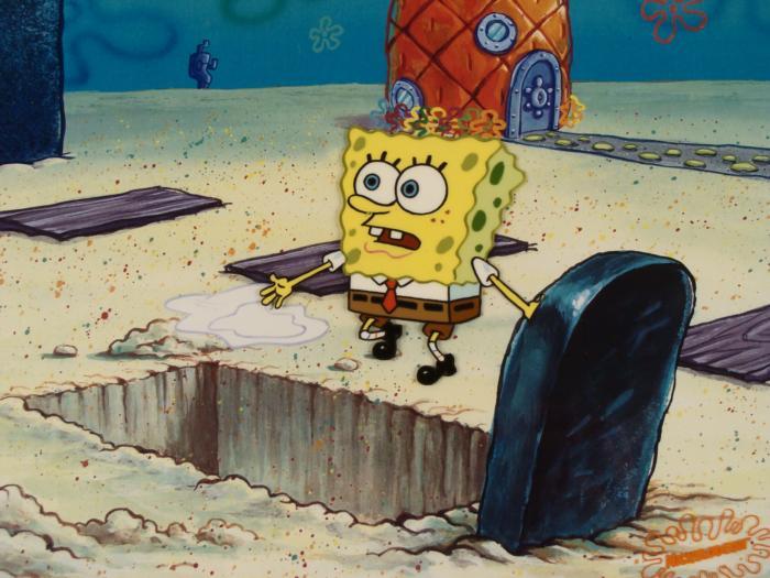This animation cel and reproduction background are from the Nickelodeon TV show SpongeBob Squarepants. The story takes place under the deep blue sea in Bikini Bottom, where SpongeBob resides. SpongeBob, who is a yellow, porous sponge, is your typical happy-go-lucky character, as he is always cheerful and enjoys making people laugh. Patrick Star, SpongeBob's neighbor who is a starfish, is your average children's show idiot, as he boasts knowing nothing and is often getting himself into ridiculous situations. Between the homes of these two lies the home of the miserable Squidward, a squid, who is known for being grouchy and playing tricks on SpongeBob and Patrick. Both SpongeBob and Squidward work at the Krusty Krab, a fast food business run by the greedy money-loving Mr. Krabs, a crab, the arch rival of the evil, possibly misunderstood, Plankton. Another neighbor, Sandy Cheeks, an athletic squirrel who normally wears an astronaut's space suit, was introduced in "Tea at the Treedome." She spends most of her time inventing and experimenting. SpongeBob is next to a grave stone.Original Printed Background and Animated Cel Overall Size of Background: 11" x 17" Overall Size of the Cel: 10 1/2" x 12 1/2" Very good condition This is an original hand-painted cel set-up used in the production of an episode of "SpongeBob SquarePants." Each one-of-a-kind set-up represents a slight change in position of the characters. When individually photographed and projected in rapid succession, the images appear to move.