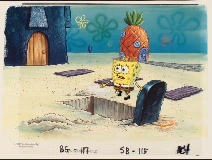 This animation cel and reproduction background are from the Nickelodeon TV show SpongeBob Squarepants. The story takes place under the deep blue sea in Bikini Bottom, where SpongeBob resides. SpongeBob, who is a yellow, porous sponge, is your typical happy-go-lucky character, as he is always cheerful and enjoys making people laugh. Patrick Star, SpongeBob's neighbor who is a starfish, is your average children's show idiot, as he boasts knowing nothing and is often getting himself into ridiculous situations. Between the homes of these two lies the home of the miserable Squidward, a squid, who is known for being grouchy and playing tricks on SpongeBob and Patrick. Both SpongeBob and Squidward work at the Krusty Krab, a fast food business run by the greedy money-loving Mr. Krabs, a crab, the arch rival of the evil, possibly misunderstood, Plankton. Another neighbor, Sandy Cheeks, an athletic squirrel who normally wears an astronaut's space suit, was introduced in "Tea at the Treedome." She spends most of her time inventing and experimenting. SpongeBob is next to a grave stone.Original Printed Background and Animated Cel Overall Size of Background: 11" x 17" Overall Size of the Cel: 10 1/2" x 12 1/2" Very good condition This is an original hand-painted cel set-up used in the production of an episode of "SpongeBob SquarePants." Each one-of-a-kind set-up represents a slight change in position of the characters. When individually photographed and projected in rapid succession, the images appear to move.
