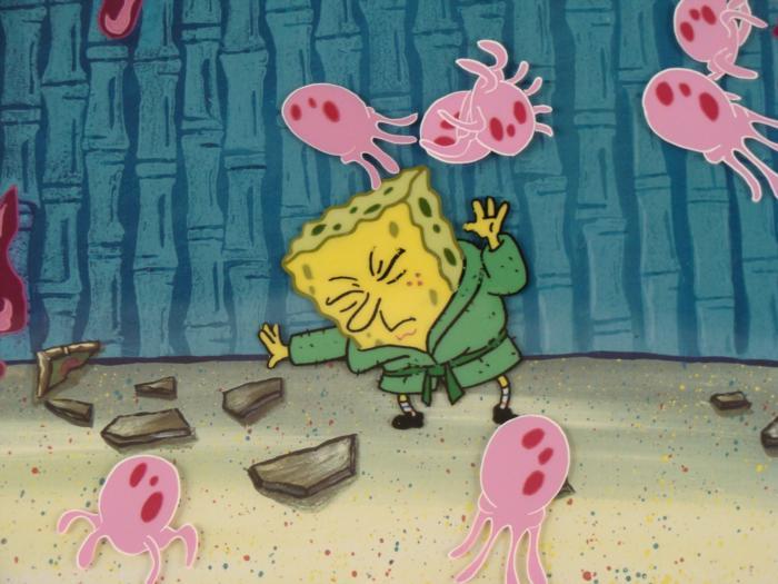 This animation cel and reproduction background are from the Nickelodeon TV show SpongeBob Squarepants. The story takes place under the deep blue sea in Bikini Bottom, where SpongeBob resides. SpongeBob, who is a yellow, porous sponge, is your typical happy-go-lucky character, as he is always cheerful and enjoys making people laugh. Patrick Star, SpongeBob's neighbor who is a starfish, is your average children's show idiot, as he boasts knowing nothing and is often getting himself into ridiculous situations. Between the homes of these two lies the home of the miserable Squidward, a squid, who is known for being grouchy and playing tricks on SpongeBob and Patrick. Both SpongeBob and Squidward work at the Krusty Krab, a fast food business run by the greedy money-loving Mr. Krabs, a crab, the arch rival of the evil, possibly misunderstood, Plankton. Another neighbor, Sandy Cheeks, an athletic squirrel who normally wears an astronaut's space suit, was introduced in "Tea at the Treedome." She spends most of her time inventing and experimenting. How did the jellyfish get into SpongeBob's house?Original Printed Background and Animated Cel Overall Size of Background: 11" x 17" Overall Size of the Cel: 10 1/2" x 12 1/2" Very good condition This is an original hand-painted cel set-up used in the production of an episode of "SpongeBob SquarePants." Each one-of-a-kind set-up represents a slight change in position of the characters. When individually photographed and projected in rapid succession, the images appear to move.