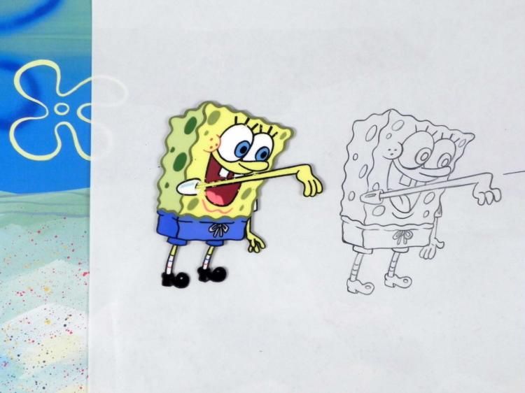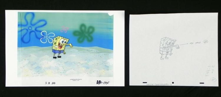 Normal 0 false false false MicrosoftInternetExplorer4 /* Style Definitions */ table.MsoNormalTable{mso-style-name:"Table Normal";mso-tstyle-rowband-size:0;mso-tstyle-colband-size:0;mso-style-noshow:yes;mso-style-parent:"";mso-padding-alt:0in 5.4pt 0in 5.4pt;mso-para-margin:0in;mso-para-margin-bottom:.0001pt;mso-pagination:widow-orphan;font-size:10.0pt;font-family:"Times New Roman";mso-ansi-language:#0400;mso-fareast-language:#0400;mso-bidi-language:#0400;}This original animation cel, reproduction background, and drawing are from the NickelodeonTV show SpongeBob Squarepants. The story takes place under the deepblue sea in Bikini Bottom, where SpongeBob resides. SpongeBob, who is ayellow, porous sponge, is your typical happy-go-lucky character, as he isalways cheerful and enjoys making people laugh. Patrick Star, SpongeBob'sneighbor who is a starfish, is your average children's show idiot, as he boastsknowing nothing and is often getting himself into ridiculous situations.Between the homes of these two lies the home of the miserable Squidward, asquid, who is known for being grouchy and playing tricks on SpongeBob andPatrick. Both SpongeBob and Squidward work at the Krusty Krab, a fast foodbusiness run by the greedy money-loving Mr. Krabs, a crab, the arch rival ofthe evil, possibly misunderstood, Plankton. Another neighbor, Sandy Cheeks, anathletic squirrel who normally wears an astronaut's space suit, was introducedin "Tea at the Treedome." She spends most of her time inventing andexperimenting. * * Here, you can have this. A similar matching bonus drawing overlay of Spongebob is also included. * Original Production Animated Cel, Reproduction Background and Drawing Original "rough" animation drawing, in black pencil, with notations in black. Overall Size of Drawing: 10 1/2" x 12 1/2" Overall Size of Cel: 10 1/2" x 12 1/2" Overall Size of the Reproduction Background: 11" x 17" * Very Good ConditionThis is an original hand-painted cel set-up used in the productionof an episode of "SpongeBob SquarePants." Each one-of-a-kind set-uprepresents a slight change in position of the characters. When individuallyphotographed and projected in rapid succession, the images appear to move. * To create production cels, the original animator's drawing is transferred ontoan acetate cel (by hand-inking and/or photo copying). The cel is thenhand-painted on the reverse side. The background accompanying this set-up is a reproduction background. * * The cel, reproduction background and drawing are ready to be matted andframed. The animator's notations are atthe bottom of the cel and background and top and bottom of the drawing. There is some paint fade to Spongebob's outline. * *