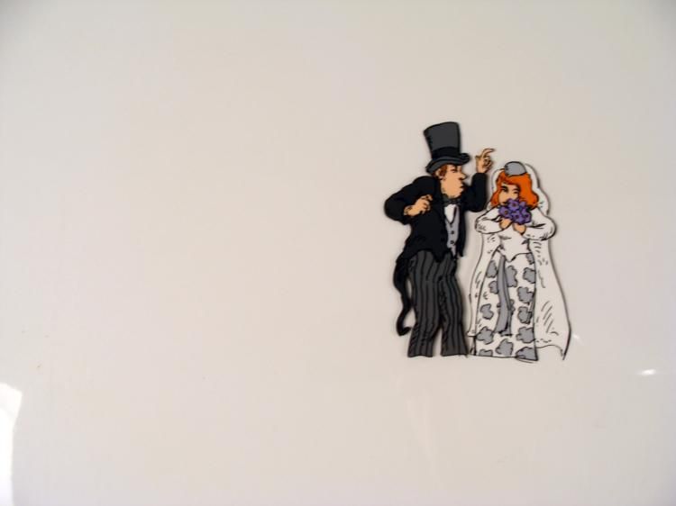 This is an original animation cel of a bride and groom. * * * * Bride: Wait, for it, Wait for it... Groom: You worthless, no good... * * Medium: Hand painted acetate cel * * Cel size: 10 1/2" x 12 1/2" * * Notations: Bottom of cel * * Condition: Excellent