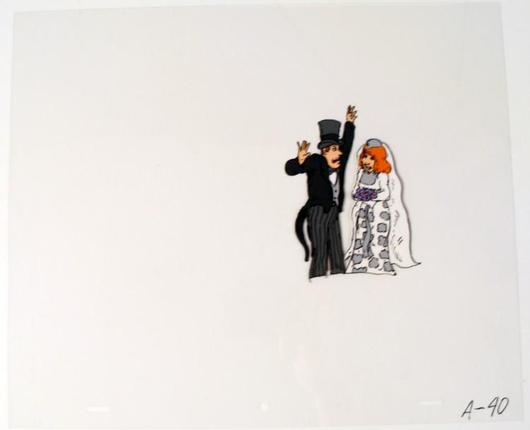 This is an original animation cel of a bride and groom. * * * * Groom: You're so EVIL - Bride: I know and I love it!! * * * Medium: Hand painted acetate cel * * Cel size: 10 1/2" x 12 1/2" * * Notations: Bottom of cel * * Condition: Excellent
