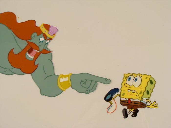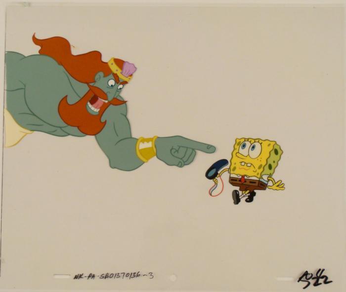 This original animation cel is from the Nickelodeon TV show SpongeBob Squarepants. The story takes place under the deep blue sea in Bikini Bottom, where SpongeBob resides. SpongeBob, who is a yellow, porous sponge, is your typical happy-go-lucky character, as he is always cheerful and enjoys making people laugh. Patrick Star, SpongeBob's neighbor who is a starfish, is your average children's show idiot, as he boasts knowing nothing and is often getting himself into ridiculous situations. Between the homes of these two lies the home of the miserable Squidward, a squid, who is known for being grouchy and playing tricks on SpongeBob and Patrick. Both SpongeBob and Squidward work at the Krusty Krab, a fast food business run by the greedy money-loving Mr. Krabs, a crab, the arch rival of the evil, possibly misunderstood, Plankton. Another neighbor, Sandy Cheeks, an athletic squirrel who normally wears an astronaut's space suit, was introduced in "Tea at the Treedome." She spends most of her time inventing and experimenting. King Neptune appears to be making Spongebob feel like a nobody.Original Production Animated Cel Overall Size of Cel: 10 1/2" x 12 1/2" Excellent ConditionThis is an original hand-painted cel set-up used in the production of an episode of "SpongeBob SquarePants." Each one-of-a-kind set-up represents a slight change in position of the characters. When individually photographed and projected in rapid succession, the images appear to move.